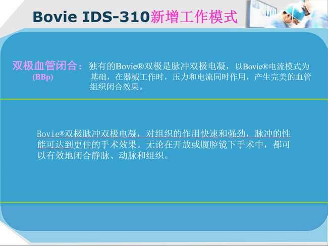 IDS智能數(shù)字化系統(tǒng) Bovie IDS系列是當(dāng)今現(xiàn)代手術(shù)領(lǐng)域中應(yīng)用的全數(shù)字化的、創(chuàng)新科技的電外科儀器。它簡單易用,并且集中了大部分的電外科手術(shù)需要的功能。單極和雙極功能最大程度地滿足了醫(yī)生對高頻電刀既要安全,又要易用的要求。數(shù)字化技術(shù)使IDS系列產(chǎn)品在實(shí)際手術(shù)運(yùn)用中非常簡單方便,可以讓醫(yī)生真正地把精力放在最重要的地方----手術(shù)本身和患者身上。
