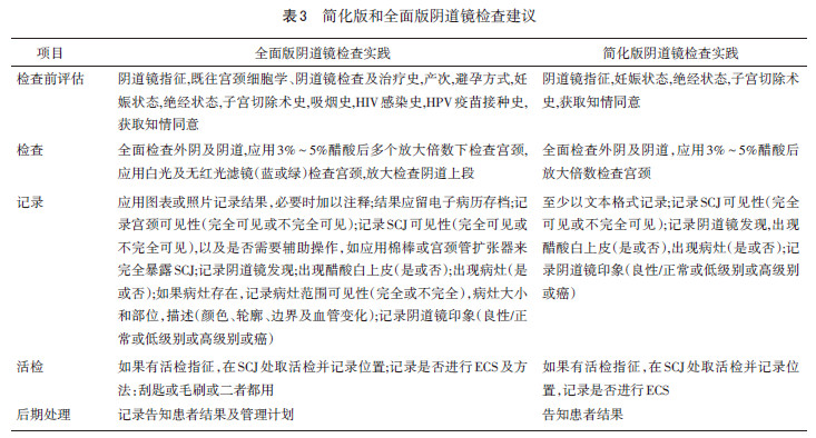 ASCCP此次發(fā)布的簡化版和全面版陰道鏡檢查的程序建議,提出以下6項主要內(nèi)容:術(shù)前評估、陰道鏡檢查、輔助物的使用、結(jié)果記錄、活檢取樣和術(shù)后常規(guī)(見表3)。推薦的簡化版陰道鏡檢查,其術(shù)前評估要點包括患者陰道鏡檢查指征、妊娠狀態(tài)、是否絕經(jīng)、子宮切除術(shù)史及簽署知情同意書。而全面版陰道鏡檢查,除了簡化版的內(nèi)容要求外,還有一些推薦的要點:患者既往宮頸細胞學結(jié)果、陰道鏡檢查結(jié)果、宮頸病變治療史、產(chǎn)次、避孕方式、吸煙史、HIV感染情況和HPV疫苗接種情況等。在簡化版的陰道鏡檢查中,術(shù)者需先檢查患者的外陰和陰道,然后再給宮頸涂抹3%~5%醋酸后放大觀察宮頸情況。而全面的陰道鏡檢查則強調(diào)還需放大觀察陰道上段,然后在宮頸涂抹3%~5%醋酸后,使用多倍放大鏡,白光及(藍或綠)濾鏡檢查宮頸。簡化版陰道鏡檢查僅需用文字記錄結(jié)果,而全面的陰道鏡檢查還需使用圖表、照片,盡量在病變部位做標注,并將結(jié)果導(dǎo)入電子病歷中。需要強調(diào)的是,不論是簡化版還是全面版,SCJ的可見性,是否有醋酸白改變以及病灶情況均需詳細記錄。每一個陰道鏡檢查都要記錄陰道鏡評估印象(正常/良性或LSIL或HSIL或癌)。此外,全面版還需記錄是否需要特殊處理才能使SCJ完全可見;若有病灶,需記錄其可見情況(完全或不完全),病灶的大小,位置和描述其特征(顏色,形狀,邊界,血管改變)。若需活檢,簡化版和全面版都強調(diào)應(yīng)在SCJ取樣,并記錄是否行ECS。全面版需記錄活檢位置,如行ECS,還需記錄其方式。最后,所有術(shù)者均應(yīng)告知患者病變活檢及ECS的結(jié)果,以及后續(xù)的治療計劃。