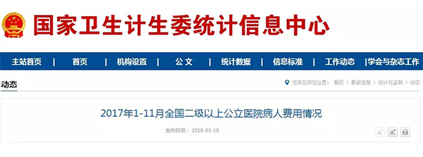 3月16日,國家衛(wèi)計(jì)委發(fā)布2017年1-11月的全國二級以上公立醫(yī)院病人費(fèi)用情況、全國醫(yī)療服務(wù)情況、全國醫(yī)療衛(wèi)生機(jī)構(gòu)數(shù)。