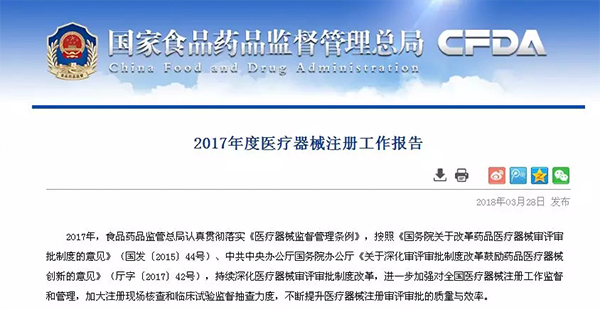 近日,國(guó)家食品藥品監(jiān)督管理總局發(fā)布《2017年度醫(yī)療器械注冊(cè)工作報(bào)告》,報(bào)告中提到,2017年,食品藥品監(jiān)管總局按照《創(chuàng)新醫(yī)療器械特別審批程序(試行)》,批準(zhǔn)了部分創(chuàng)新醫(yī)療器械產(chǎn)品上市。共收到創(chuàng)新醫(yī)療器械特別審批申請(qǐng)273項(xiàng),完成323項(xiàng)審查(含2016年申請(qǐng)事項(xiàng)),確定63個(gè)產(chǎn)品進(jìn)入創(chuàng)新醫(yī)療器械特別審批通道。