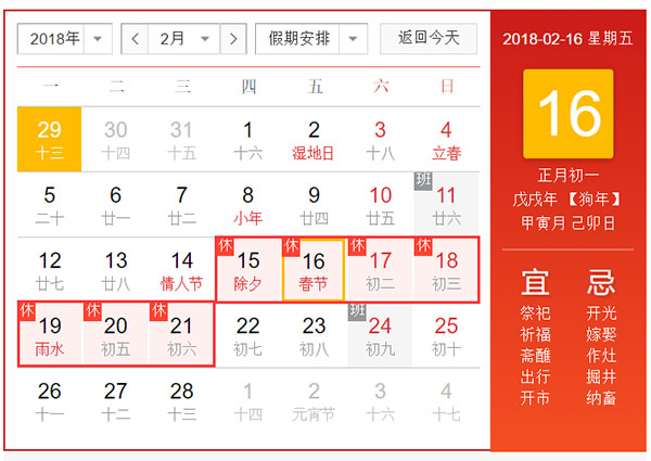 根據(jù)國(guó)家規(guī)定、北京華康普美科技有限公司2018年春節(jié)放假安排如下:2018年2月15日至2017年2月21日放假調(diào)休,共7天。春節(jié)前2月11日(星期日)正常上班,春節(jié)后2月24日(星期六)正常上班。