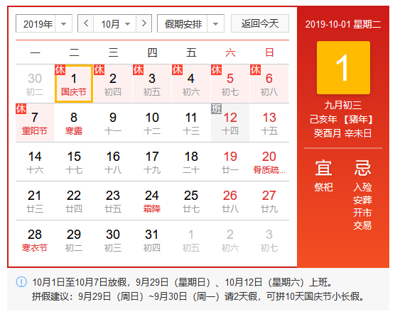 2019年北京華康普美科技有限公司,“國(guó)慶節(jié)”假期為:10月1日(星期二)至10月7日(星期一)放假調(diào)休,共7天,9月29日(星期日)和10月12日(星期六)上班。國(guó)慶節(jié)假期安排見下圖:
