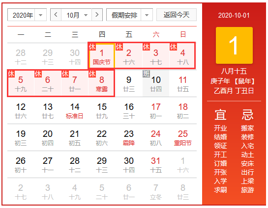 2020年北京華康普美科技有限公司,中秋節(jié)&國慶節(jié)假期為:10月1日-10月8日放假調(diào)休,共8天,9月27日(星期日)、10月10日(星期六)上班。