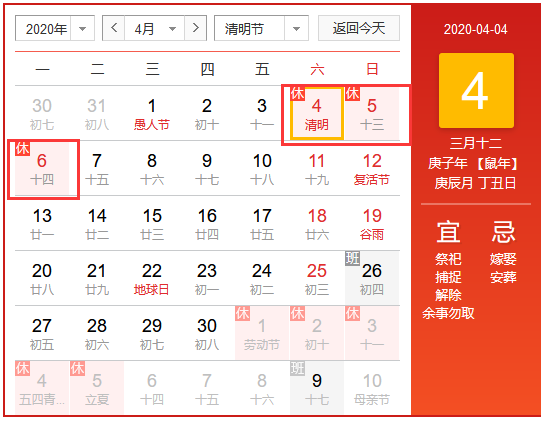 2020年北京華康普美科技有限公司,“清明節(jié)”假期為:4月6日放假,與周末連休。