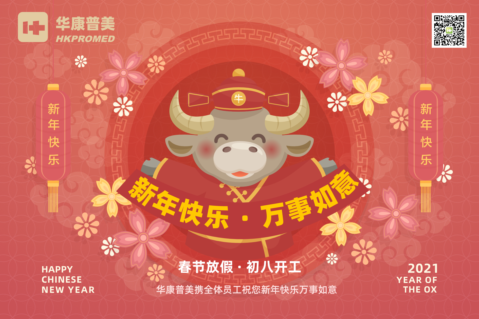 2021年春節(jié)在即,感謝各位醫(yī)院用戶,及醫(yī)療器械經(jīng)銷商長期以來對北京華康普美的支持與厚愛!向您致以最誠摯的祝福和問候北京華康普美全體員工提前給各位拜個(gè)早年!在牛氣沖天的新年里,祝您牛轉(zhuǎn)乾坤,牛運(yùn)當(dāng)頭