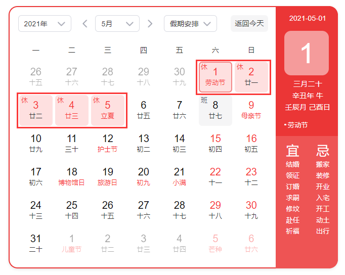 2021年北京華康普美科技有限公司,“五一勞動(dòng)節(jié)”假期為:5月1日-5月5日放假調(diào)休,共5天。 4月25日(星期日)、5月8日(星期六)上班。