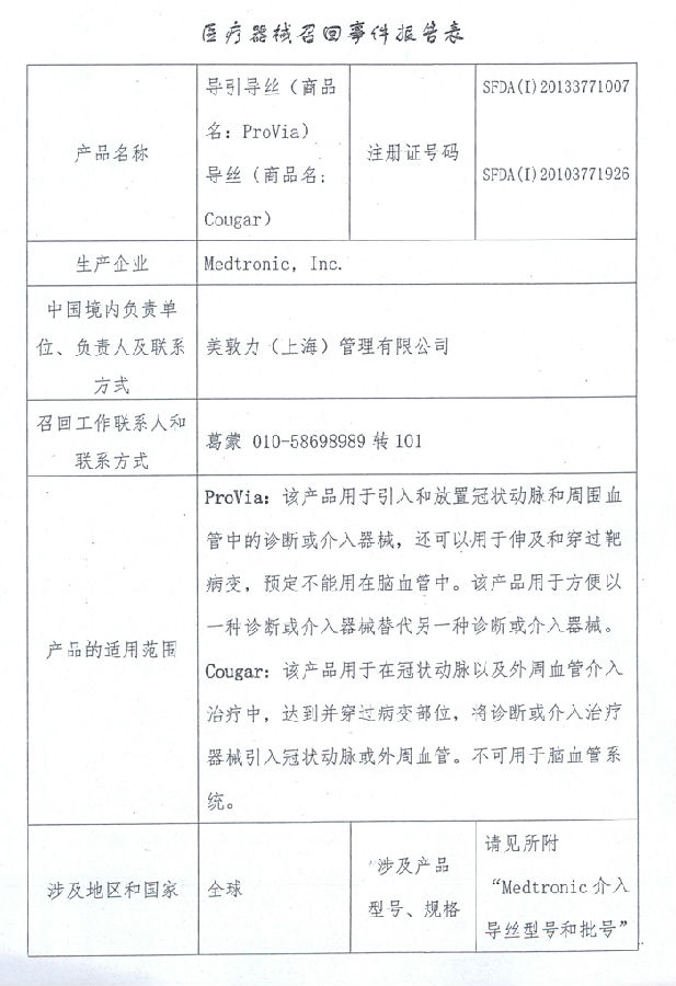 根據(jù)2013年12月2日上海市食品藥品監(jiān)督管理局的報(bào)告,由于PTFE(聚四氟乙烯)涂層可能會(huì)從導(dǎo)絲上脫落分離等原因,Medtronic,Inc.公司對其生產(chǎn)的導(dǎo)引導(dǎo)絲(注冊號:國食藥監(jiān)械(進(jìn))字2013第3771007號)、導(dǎo)絲(注冊號:國食藥監(jiān)械(進(jìn))字2010第3771926號)進(jìn)行主動(dòng)召回。請各省、自治區(qū)、直轄市食品藥品監(jiān)督管理局加強(qiáng)對此類產(chǎn)品的監(jiān)督管理。