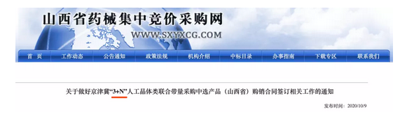 今日(10月9日),山西省藥械集中招標(biāo)采購中心發(fā)布《關(guān)于做好京津冀“3+N”人工晶體類聯(lián)合帶量采購中選產(chǎn)品購銷合同簽訂相關(guān)工作的通知》,據(jù)賽柏藍(lán)器械觀察, 此前的說法一直為3+6,目前最新的文件內(nèi)容為3+N。