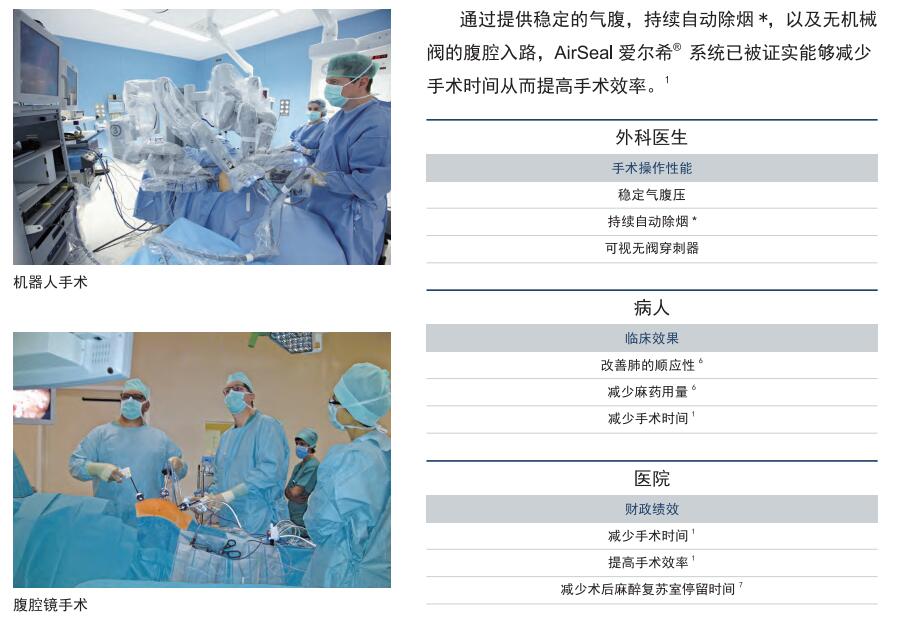 數(shù)據(jù)顯示,以前很難實現(xiàn)在低腹壓下操作腹腔鏡手術(shù)是由于采用了傳統(tǒng)氣腹機注氣技術(shù)的局限性。AirSeal 愛爾希® 系統(tǒng)采用獨特的穩(wěn)定氣腹壓以及持續(xù)自動除煙*的功能使外科醫(yī)生實現(xiàn)在低腹壓下完成手術(shù)而不影響手術(shù)視野。
