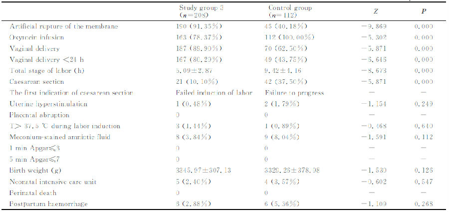 對(duì)照組:引產(chǎn)前經(jīng)陰道檢查確定宮頸Bishop評(píng)分≥6分,早晨8∶00~9∶00點(diǎn)開(kāi)始小劑量縮宮素靜滴(使用輸液泵),方法為:縮宮素2U加入500mL晶體液中,以24mL/h開(kāi)始靜滴,根據(jù)宮縮調(diào)整滴速,每15min調(diào)整一次,每次增加24mL/h,直到出現(xiàn)有效宮縮(10min內(nèi)3次宮縮,每次宮縮持續(xù)30s以上)為止,最大滴速為144mL/h。如果達(dá)到最大滴速仍然不能誘發(fā)有效宮縮,則增加縮宮素濃度為1U/100mL后重新調(diào)整滴速。靜滴縮宮素期間有專人監(jiān)護(hù)胎心和宮縮情況等。規(guī)律宮縮8h仍未臨產(chǎn)者,則停止縮宮素靜滴,休息至次晨再次縮宮素靜滴引產(chǎn)。引產(chǎn)過(guò)程中酌情人工破膜。