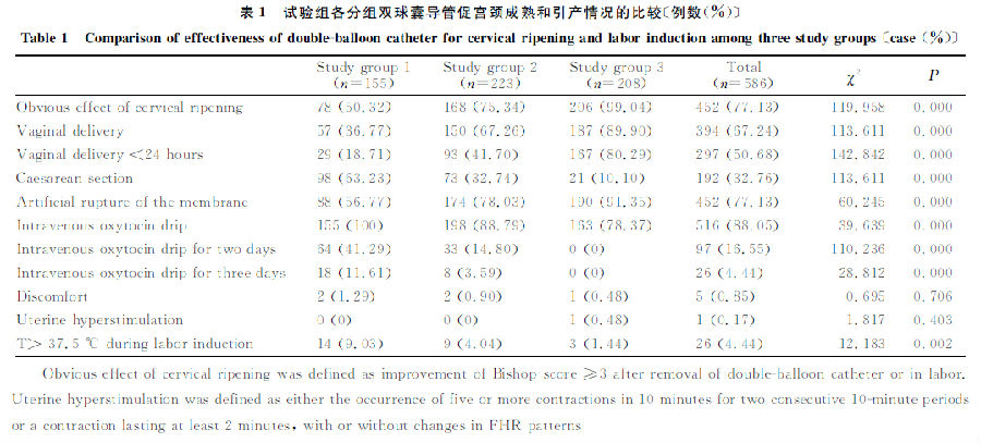 表1 試驗(yàn)組各分組雙球囊導(dǎo)管促宮頸成熟和引產(chǎn)情況的比較〔例數(shù)(%)〕
