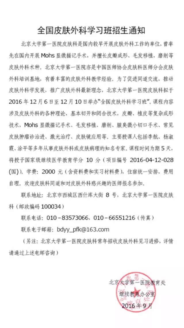 北京大學第一醫(yī)院皮膚科是國內(nèi)較早開展皮膚外科工作的單位,曾率先在國內(nèi)開展Mohs顯微描記手術,并擅長皮瓣成形、毛發(fā)移植,磨削等皮膚外科術種。北京大學第一醫(yī)院亦是中國醫(yī)師協(xié)會皮膚科醫(yī)師分會皮膚外科培訓基地,有著豐富的皮膚外科教學經(jīng)驗。為了促進同道交流,推動皮膚外科學發(fā)展,推廣皮膚外科最新理念,北京大學第一醫(yī)院皮膚科擬于2016年12月6-10日舉辦“全國皮膚外科學習班”。
