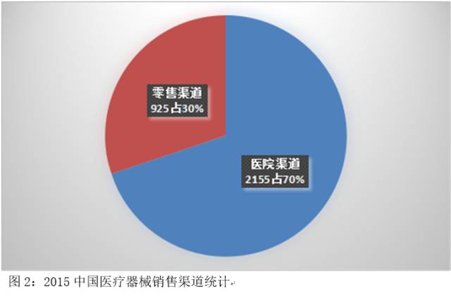 2015年我國醫(yī)療器械約為3080億元的市場銷售規(guī)模中,醫(yī)院市場約為2155億元,約占70%;零售市場銷售約為925億元,約占30%。