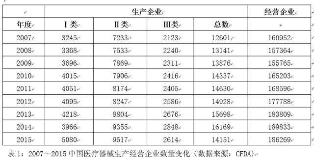 藍皮書指出,自 2007 年以來,我國醫(yī)療器械生產(chǎn)企業(yè)無論是Ⅰ類、 Ⅱ類、Ⅲ類都在穩(wěn)步增長,8年間總量由 1.26 萬家增長到了2014年的1.6萬多家,年均增長率約3%。