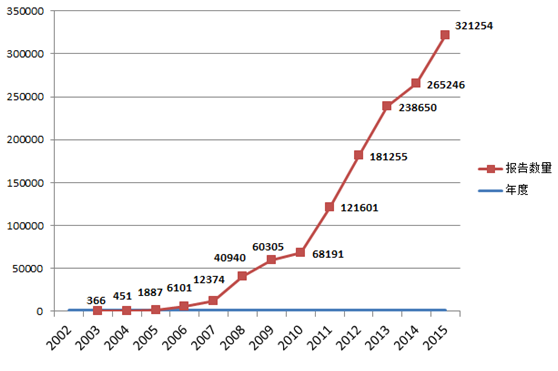 圖1-1 2002-2015年全國(guó)可疑醫(yī)療器械不良事件報(bào)告數(shù)量