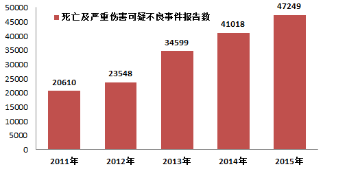 圖1-2 2011-2015年全國(guó)死亡及嚴(yán)重傷害可疑不良事件報(bào)告數(shù)比較