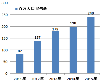 圖1-3 2011-2015年全國(guó)每百萬(wàn)人口平均報(bào)告數(shù)比較