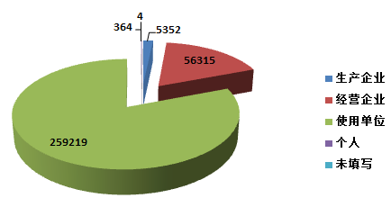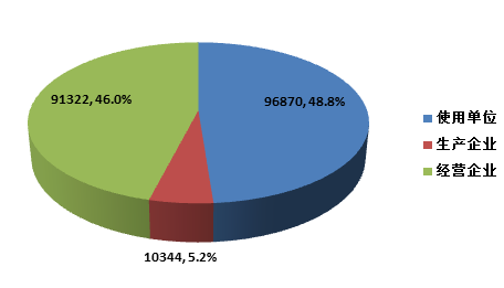 截止2015年12月31日,在全國(guó)醫(yī)療器械不良事件監(jiān)測(cè)系統(tǒng)中,注冊(cè)基層用戶(包括醫(yī)療器械生產(chǎn)企業(yè)、經(jīng)營(yíng)企業(yè)和使用單位)共198, 536家。其中,醫(yī)療器械生產(chǎn)企業(yè)10,344家,占注冊(cè)基層用戶總數(shù)的5.2%;經(jīng)營(yíng)企業(yè)91,322家,占注冊(cè)基層用戶的46.0%;使用單位96,870家,占注冊(cè)基層用戶的48.8%(圖1-4)。