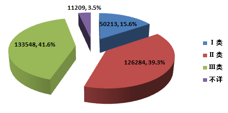 2015年,全國(guó)上報(bào)的可疑醫(yī)療器械不良事件報(bào)告中,涉及Ⅲ類醫(yī)療器械的報(bào)告133,548份,占總報(bào)告數(shù)的41.6%;涉及Ⅱ類醫(yī)療器械的報(bào)告126,284份,占總報(bào)告數(shù)的39.3%;涉及Ⅰ類醫(yī)療器械的報(bào)告50,213份,占總報(bào)告數(shù)的15.6%;部分報(bào)告涉及的器械管理類別不詳,共 11,209份,占總報(bào)告數(shù)的3.5%。數(shù)據(jù)顯示,涉及Ⅲ類和Ⅱ類醫(yī)療器械的報(bào)告占絕大多數(shù),這與醫(yī)療器械風(fēng)險(xiǎn)程度高低相吻合(圖2-3)。