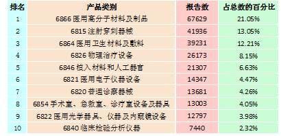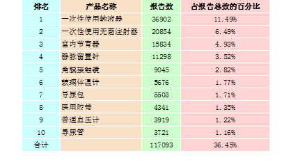 表2-2 報(bào)告數(shù)量排名前十位的無(wú)源醫(yī)療器械