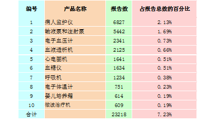 表2-3 報(bào)告數(shù)量排名前十位的有源醫(yī)療器械