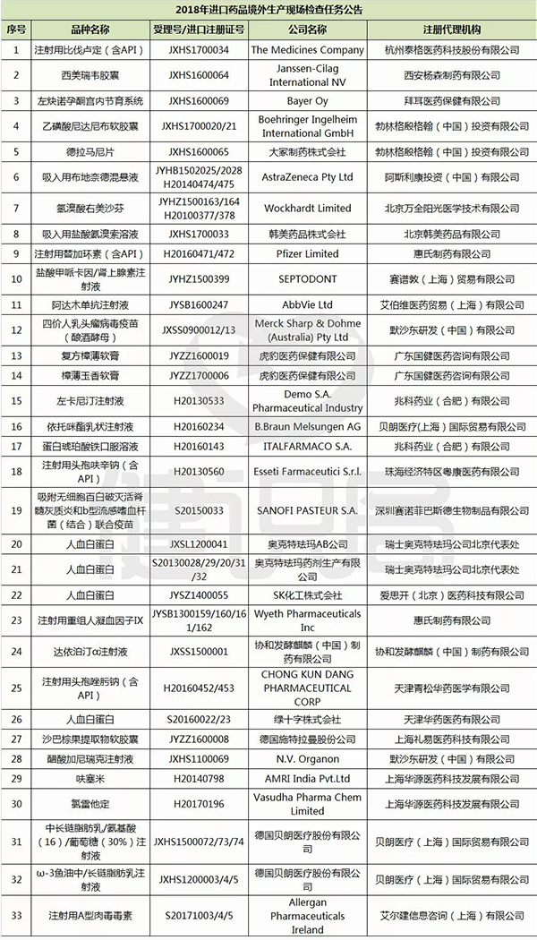 這周四,也就是2018年1月4日,CFDA將在北京召開藥品境外檢查工作企業(yè)通氣會,拜耳、輝瑞、默沙東、艾伯維、勃林格殷格翰等外資藥企的33個藥品,被納入2018年CFDA境外“飛檢”計劃,其中包括注射用替加環(huán)素(泰閣)等王牌藥品,也有四價人乳頭瘤病毒疫苗(佳達修)等今年剛過審批在中國上市的明星藥品,還包括一些已經(jīng)納入優(yōu)先審評“綠色通道“,即將在中國上市的藥品。