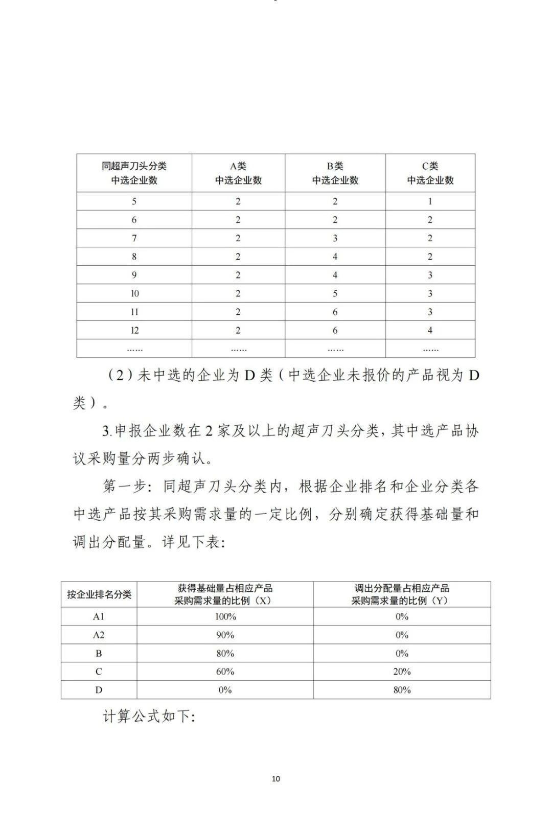 同一超聲刀頭分類內(nèi),中選企業(yè)按“企業(yè)排名”分為A、B、C三類,未中選的企業(yè)為D類,中選企業(yè)未報價的產(chǎn)品也視為D類,分類情況與協(xié)議采購量直接掛鉤(具體分配規(guī)則見文末)。