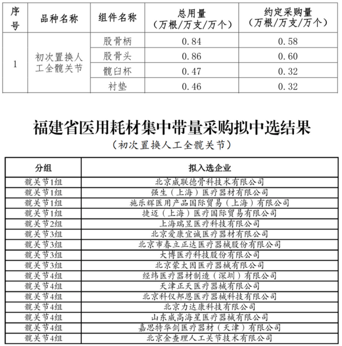 初次置換人工全髖關(guān)節(jié)擬中選企業(yè)包括強生、施樂輝、捷邁、山東威高等械企;