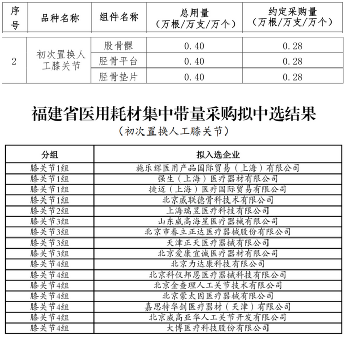 初次置換人工膝關(guān)節(jié)擬中選企業(yè)包括強生、捷邁、施樂輝、山東威高、大博醫(yī)療等械企;