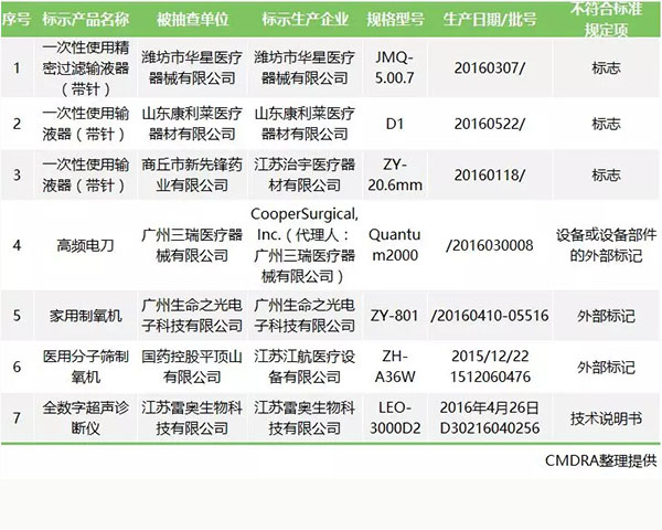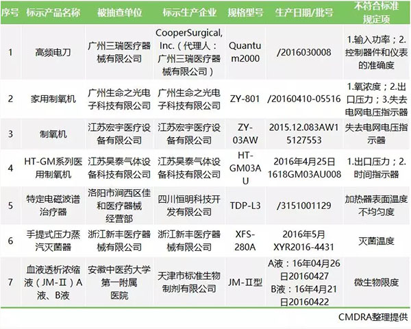 被抽檢項(xiàng)目為標(biāo)識標(biāo)簽、說明書等項(xiàng)目不符合標(biāo)準(zhǔn)規(guī)定的醫(yī)療器械產(chǎn)品:涉及7家企業(yè)的4個品種7批(臺)。