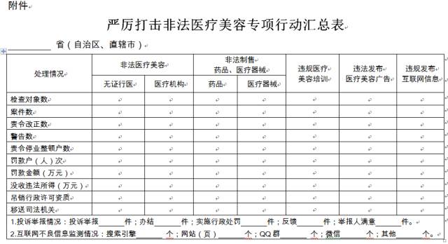 各有關(guān)部門密切配合,開展了一系列專項行動,不斷加大監(jiān)管力度,依法嚴(yán)肅查處違法違規(guī)行為,取得了一定成效。為進一步維護消費者合法權(quán)益,保護人民健康,國家衛(wèi)生計生委、中央網(wǎng)信辦、公安部、人力資源社會保障部、海關(guān)總署、工商總局、食品藥品監(jiān)管總局決定于2017年5月-2018年4月聯(lián)合開展嚴(yán)厲打擊非法醫(yī)療美容專項行動。現(xiàn)將《嚴(yán)厲打擊非法醫(yī)療美容專項行動方案》印發(fā)給你們(可從國家衛(wèi)生計生委官方網(wǎng)站下載),請認真組織實施。