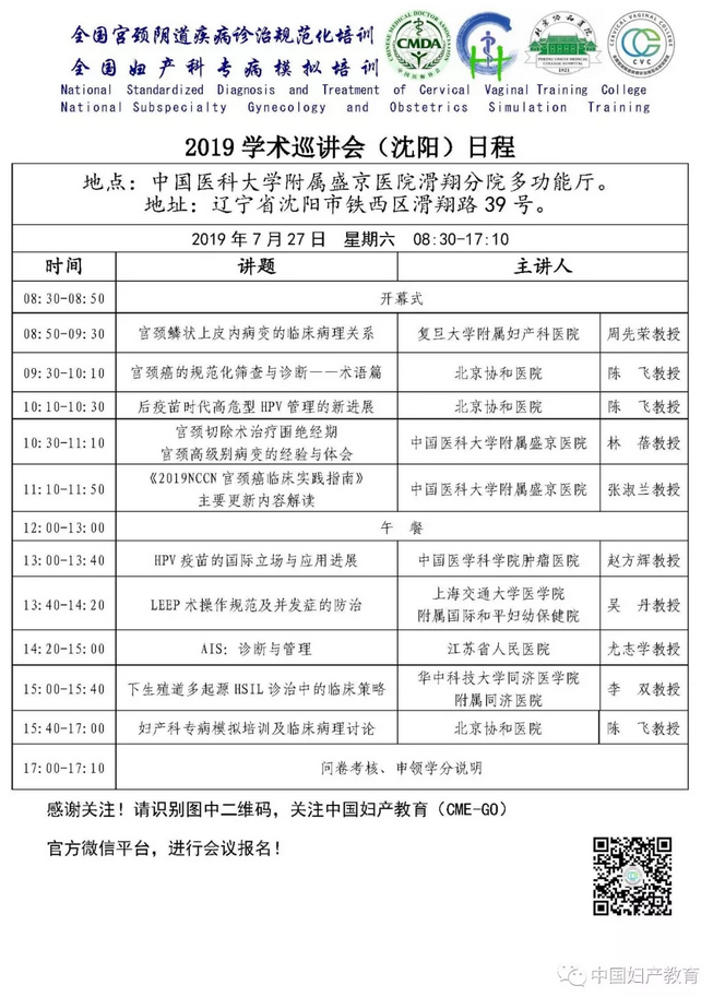 4.報(bào)名微信號(hào):中國(guó)婦產(chǎn)教育(CME-GO),掃描二維碼,關(guān)注微信平臺(tái),選擇巡講沈陽(yáng)站,完善報(bào)名信息即可完成報(bào)名。