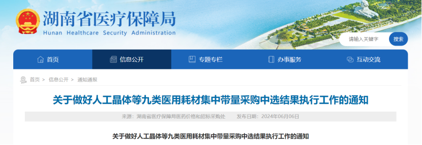 6月6日,湖南省醫(yī)保局發(fā)布《關(guān)于做好人工晶體等九類醫(yī)用耗材集中帶量采購中選結(jié)果執(zhí)行工作的通知》,自2024年7月1日起執(zhí)行人工晶體、運(yùn)動醫(yī)學(xué)、硬腦(脊)膜補(bǔ)片、疝修補(bǔ)材料、通用介入、神經(jīng)外科、血液透析、冠脈血管內(nèi)超聲診斷導(dǎo)管和輸注泵等九類醫(yī)用耗材集中帶量采購中選結(jié)果。