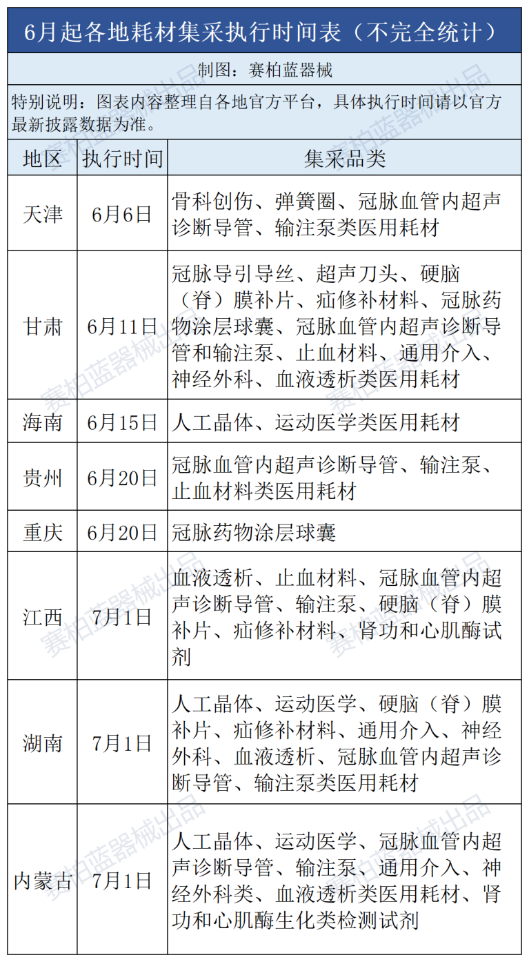 據(jù)觀察,今年5月起,多個重磅耗材聯(lián)盟集采開始進(jìn)入密集執(zhí)行期。賽柏藍(lán)器械梳理6月以來已經(jīng)和將要落地的耗材集采如下:
