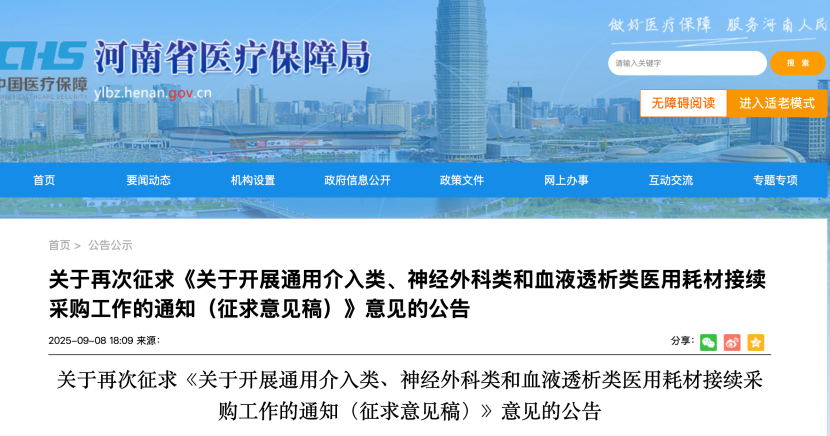 9月8日,河南醫(yī)保局發(fā)布《關(guān)于再次征求<關(guān)于開展通用介入類、神經(jīng)外科類和血液透析類醫(yī)用耗材接續(xù)采購工作的通知(征求意見稿)>意見的公告》。