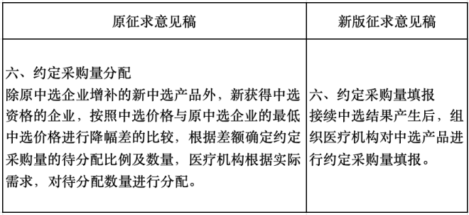約定采購量分配規(guī)則方面也有調(diào)整,按降幅差分量的內(nèi)容被刪掉,替換為醫(yī)療機(jī)構(gòu)對(duì)中選產(chǎn)品進(jìn)行約定采購量填報(bào)。