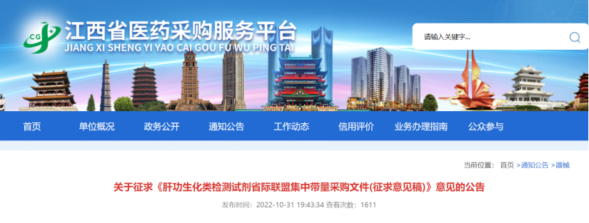 10月31日,江西省醫(yī)藥采購服務(wù)平臺(tái)《關(guān)于征求<肝功生化類檢測(cè)試劑省際聯(lián)盟集中帶量采購文件(征求意見稿)>意見的公告》(以下簡(jiǎn)稱《意見稿》)。