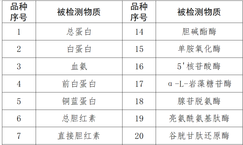 本次帶量采購的品種,是指按醫(yī)療器械管理的用于人體樣本體外檢測(cè)的單品種液體生化診斷試劑,具體被檢測(cè)物質(zhì)詳見下表。