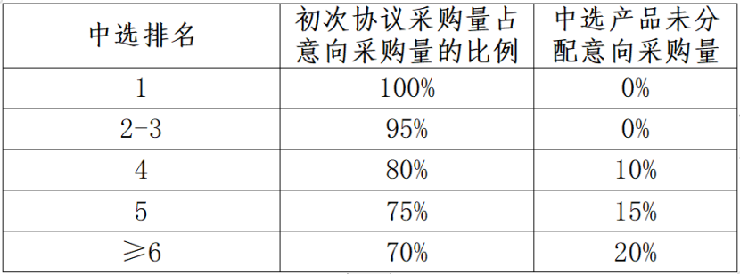 第一步:按中選排名確定初次協(xié)議采購量,初次協(xié)議采購量占意向采購量的比例見下表。根據(jù)醫(yī)療機(jī)構(gòu)的意向采購量,四舍五入取整,計(jì)算各品種各企業(yè)的初次協(xié)議采購量。