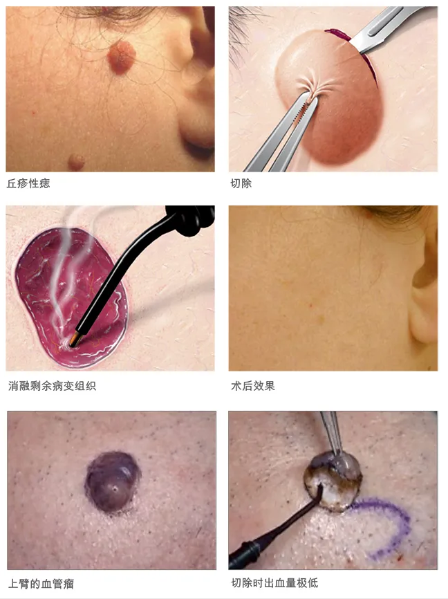皮膚外科(祛除血管瘤、毛細(xì)血管擴(kuò)張、各種痣、瘤、皮膚贅生物、瘢痕疙瘩、皮下囊腫、肥大性扁平苔蘚、結(jié)節(jié)狀癢疹、皮膚角化過度、化膿性肉芽腫等疾病的治療)