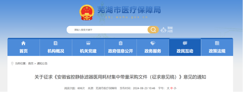 8月23日,安徽蕪湖市醫(yī)保局發(fā)布《關(guān)于征求<安徽省腔靜脈濾器醫(yī)用耗材集中帶量采購文件(征求意見稿)>意見的通知》(以下簡稱《征求意見稿》)。