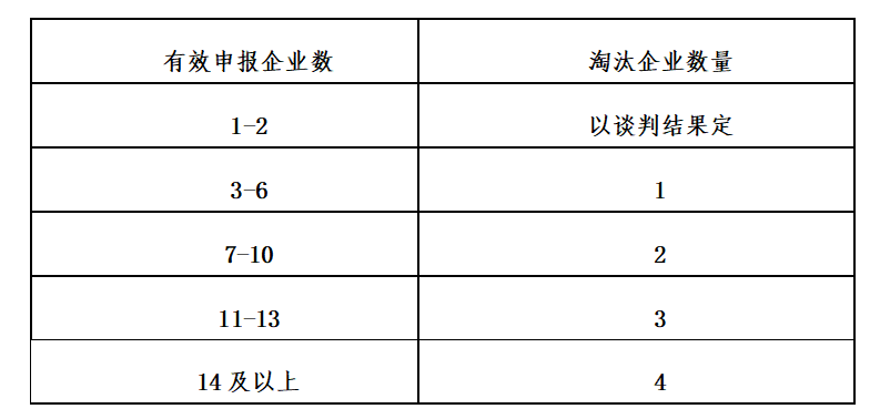 根據(jù)符合申報資格的有效申報企業(yè)數(shù),在同一分組內(nèi),確定擬中選企業(yè)數(shù)量。具體每組淘汰企業(yè)數(shù)見下表。