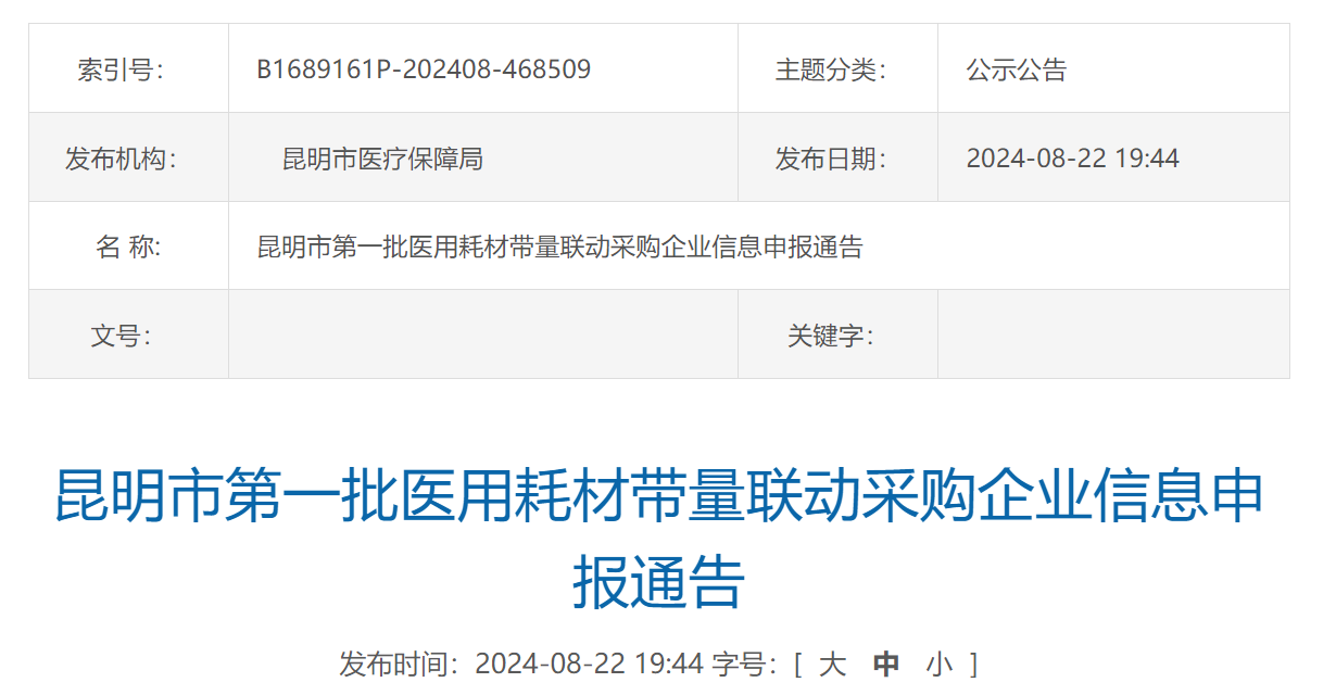 8月22日,云南昆明市醫(yī)保局發(fā)布《昆明市第一批醫(yī)用耗材帶量聯(lián)動采購企業(yè)信息申報通告》及《昆明市第一批醫(yī)用耗材帶量聯(lián)動采購工作方案》。