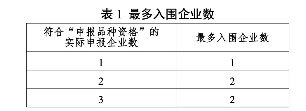 同品種入圍企業(yè)根據(jù)最多入圍企業(yè)數(shù)及申報(bào)企業(yè)順位確定,符合“申報(bào)品種資格”的實(shí)際申報(bào)企業(yè)數(shù)≥16家時(shí),最多入圍企業(yè)數(shù)為10家。