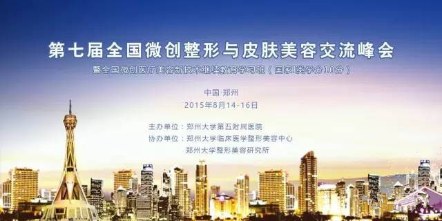第七屆中國(guó)微創(chuàng)整形與皮膚美容交流峰會(huì),由鄭州大學(xué)第五附屬醫(yī)院主辦,由鄭州大學(xué)臨床醫(yī)學(xué)整形美容中心、鄭州大學(xué)整形美容研究協(xié)辦,將于2015年8月14—16日在中國(guó)鄭州舉行。