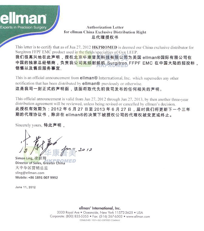 2012年6月27日,北京華康普美科技有限公司(以下簡稱“公司”)與美國Ellman International,Inc公司簽約,正式成為其超高頻射頻利普刀和周邊產(chǎn)品在中國市場的獨家全國總代理。