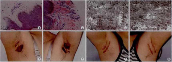 典型病例:患者女,25歲,因行雙側腋窩腫物切除術后導致瘢痕疙瘩要求行手術治療,經(jīng)檢查確定具備適應證后, 預約在門診手術室行雙側腋部瘢痕切除、拉攏縫合術,術中右側予射頻刀切除,左側予手術刀切除。術后1周,雙側腋窩傷品均無紅腫、滲出,愈合良好,無皮下血腫,瘢痕較明顯; 術后1個月,雙側腋窩瘢痕無紅腫,左側較明顯,輕微色素沉著;術后半年隨訪,患者因未遵醫(yī)囑行同位素放射治療,雙側腋窩瘢痕輕度增生,但兩側無明顯差別,且均較術前有明顯改善,患者對治療效果滿意(如圖5-8)。