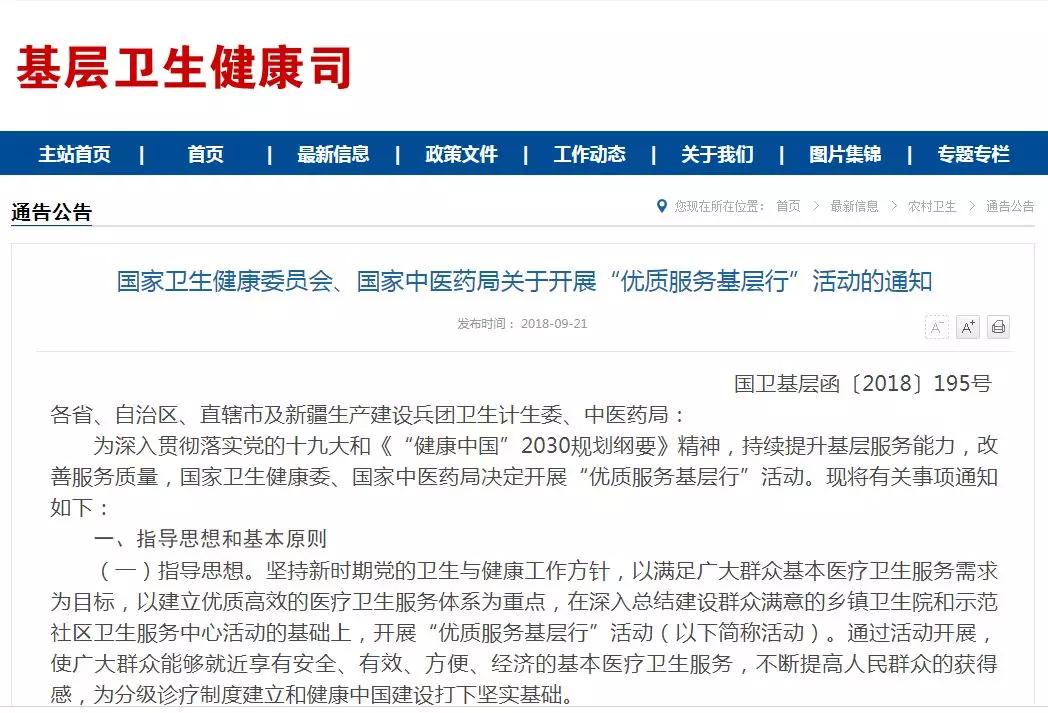 9月21日,國家衛(wèi)健委基層衛(wèi)生健康司發(fā)布《國家衛(wèi)生健康委員會(huì)、國家中醫(yī)藥局關(guān)于開展“優(yōu)質(zhì)服務(wù)基層行”活動(dòng)的通知》(以下簡(jiǎn)稱《通知》)。明確指出要重點(diǎn)發(fā)展基層醫(yī)療,提升鄉(xiāng)鎮(zhèn)衛(wèi)生院及社區(qū)衛(wèi)生服務(wù)中心的醫(yī)療服務(wù)水平,其中完善服務(wù)能力是重中之重。
