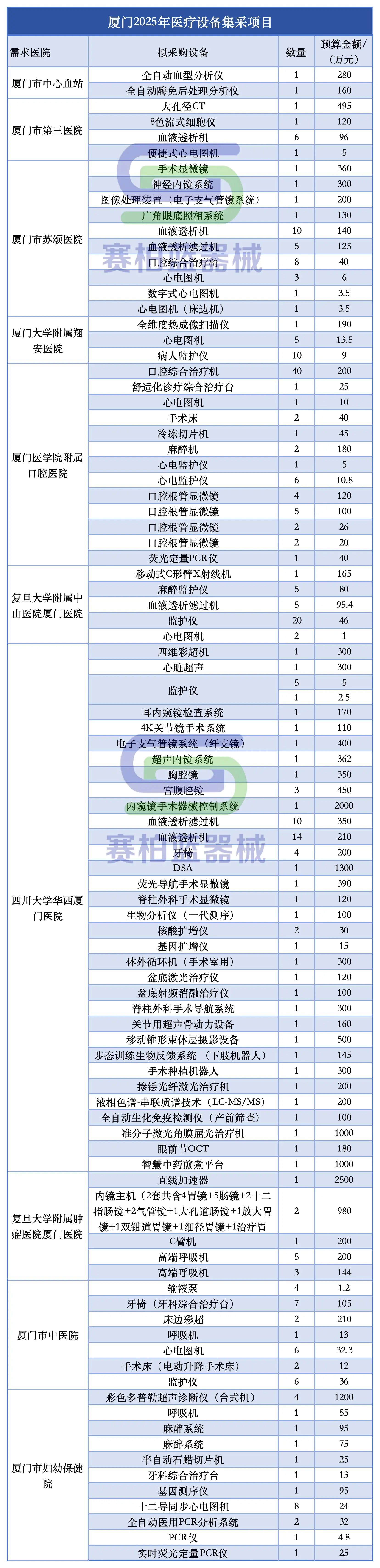 《公告》顯示,經(jīng)研究,市衛(wèi)健委擬將彩超、便攜式彩超、大孔徑CT 模擬定位機(jī)、呼吸機(jī)、監(jiān)護(hù)儀、麻醉機(jī)、內(nèi)鏡系統(tǒng)、切片機(jī)、手術(shù)床、腔鏡系統(tǒng)(胸、腹、宮腔鏡)、手術(shù)機(jī)器人、血液透析系統(tǒng)(血透機(jī)、血濾機(jī))、牙椅、移動C臂機(jī)、DSA、手術(shù)顯微鏡、電子胃腸鏡、測序儀、直線加速器、根管顯微鏡、心電圖機(jī)、PCR儀、輸液泵23個品類和單臺/套預(yù)算金額100萬及以上的設(shè)備列為2025年度醫(yī)用設(shè)備集中采購項(xiàng)目。