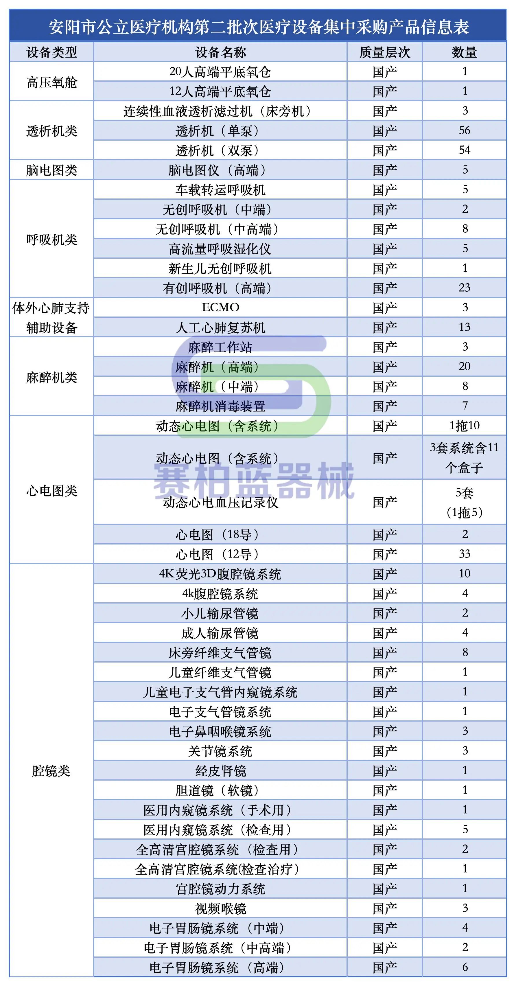 河南安陽市公立醫(yī)療機(jī)構(gòu)醫(yī)療設(shè)備集中采購聯(lián)合體計(jì)劃開展第二批次醫(yī)療設(shè)備采購,設(shè)備集中采購實(shí)行打包形式公開招標(biāo),3月已明確了第二次市場調(diào)研會相關(guān)事宜。安陽此次擬采購高壓氧艙、透析機(jī)類、腦電圖類、呼吸機(jī)類、體外心肺支持輔助設(shè)備、麻醉機(jī)類、心電圖類、腔鏡類設(shè)備,包括高端呼吸機(jī)、高端電子胃腸鏡、ECMO等在內(nèi)的諸多設(shè)備,全部要求國產(chǎn)。
